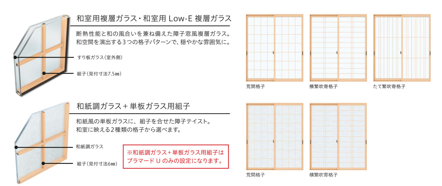 ウチリモの格子は、複層タイプが3種類と単板用が2種類となります