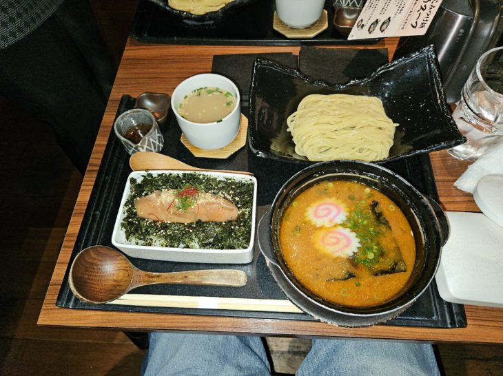 初日の博多のお昼ご飯は、30分程並んでめんたい重と明太つけ麺セット。