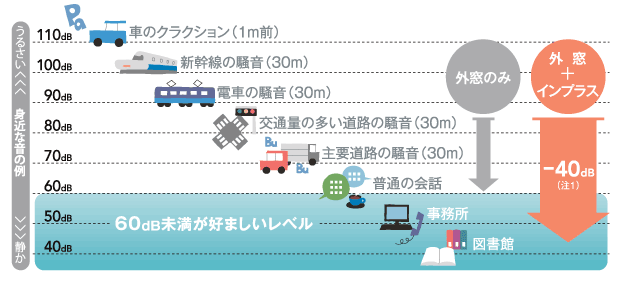 そこで内窓があるだけで防音効果がどれだけ違うか下の図をみたらわかりますか?