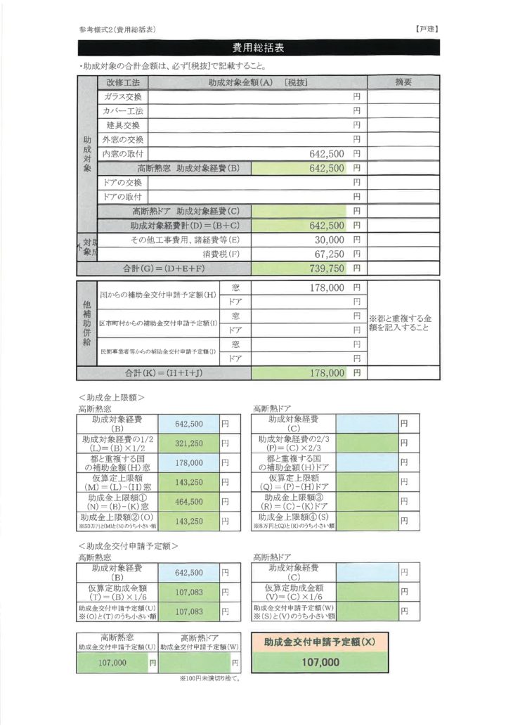 葛飾区は戸建ては最大84,000円のでマンションは57,000円の補助金になるので、1/4か最大の84,000円どちらか低い方が対象になるので、84,000円が補助金額になります。