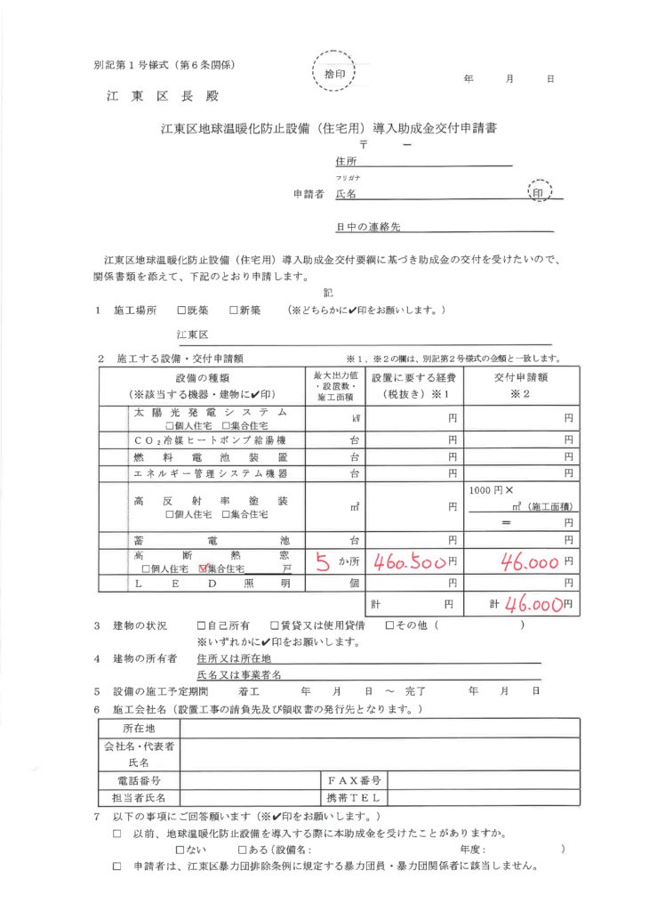 そして、江東区で行っているエコ補助金は、見積もり金額の10%で戸建て上限100,000なので、46,000円が補助予定になります。