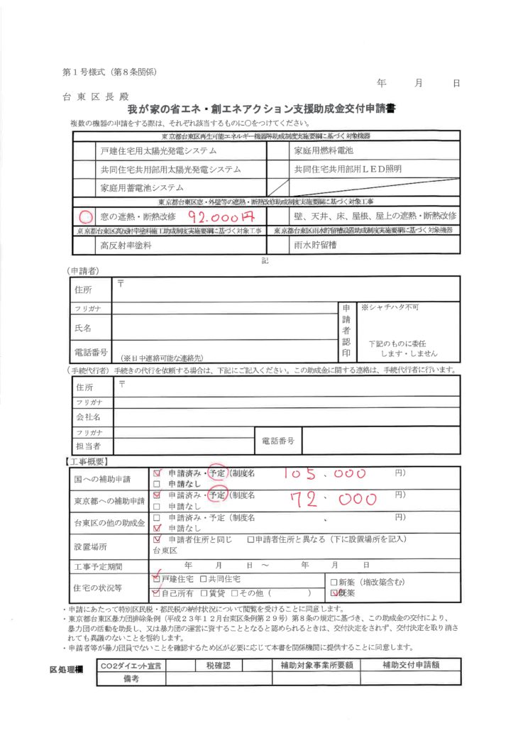 そして、文京区で行っている文京区新エネルギー・省エネエネルギー設備設置費助成は、見積もり金額の1/10で戸建て上限150,000なので、46,000円が補助予定になります。