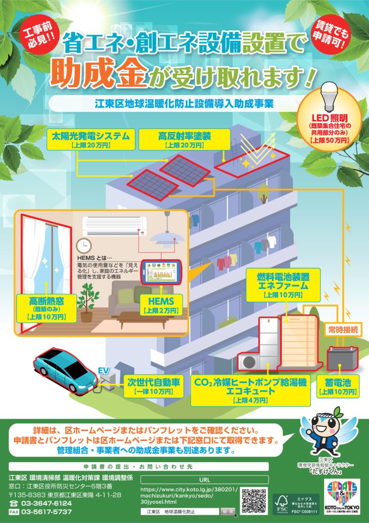 江東区では、区内に太陽光発電や省エネ設備の導入する個人・事業者・管理組合等に対して、設備費用の一部を助成し、地球温暖化防止対策を推進する事業。