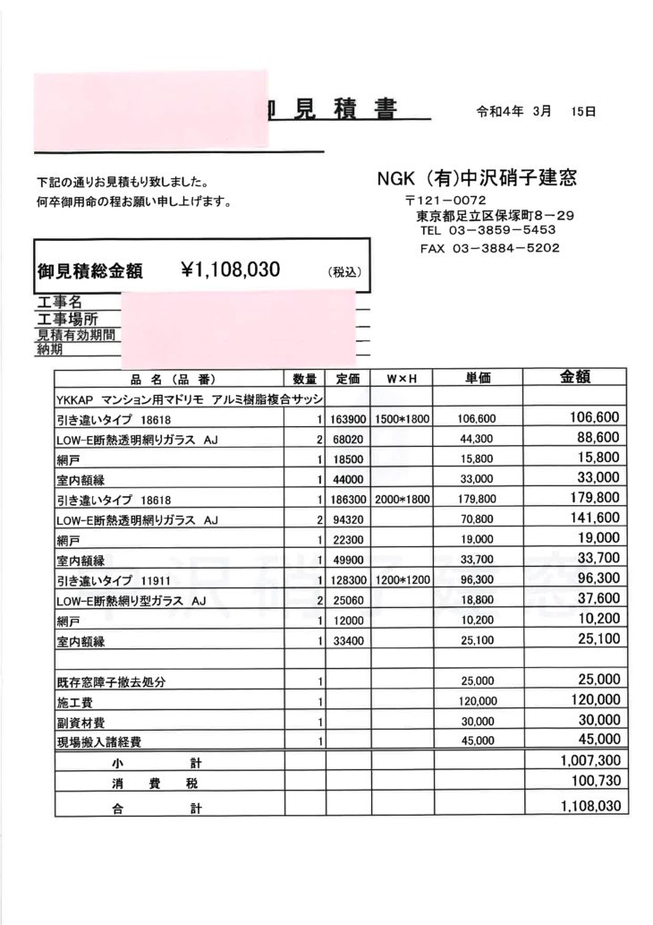 見積り金額は、1,108,030円
