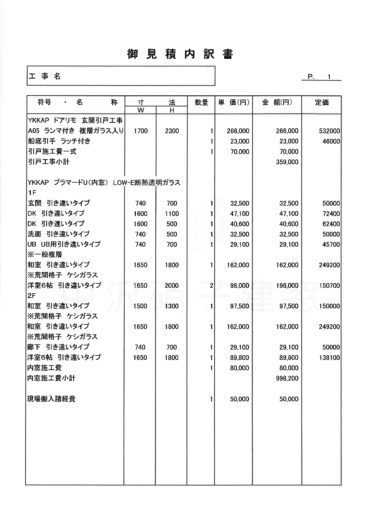 1 W1650×2000=3.3㎡ 21000円×2本=42000円
