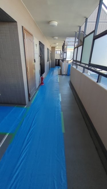 作業を行う時には、廊下を使うのでその部分には更に大きい養生をします。