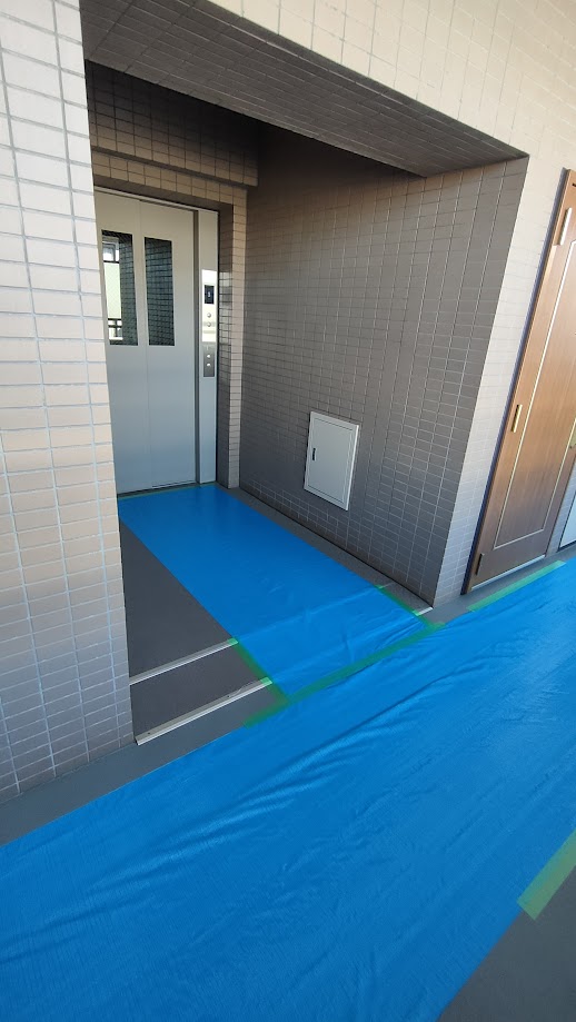廊下はもちろんですが、エレベーター前にも養生を行います。