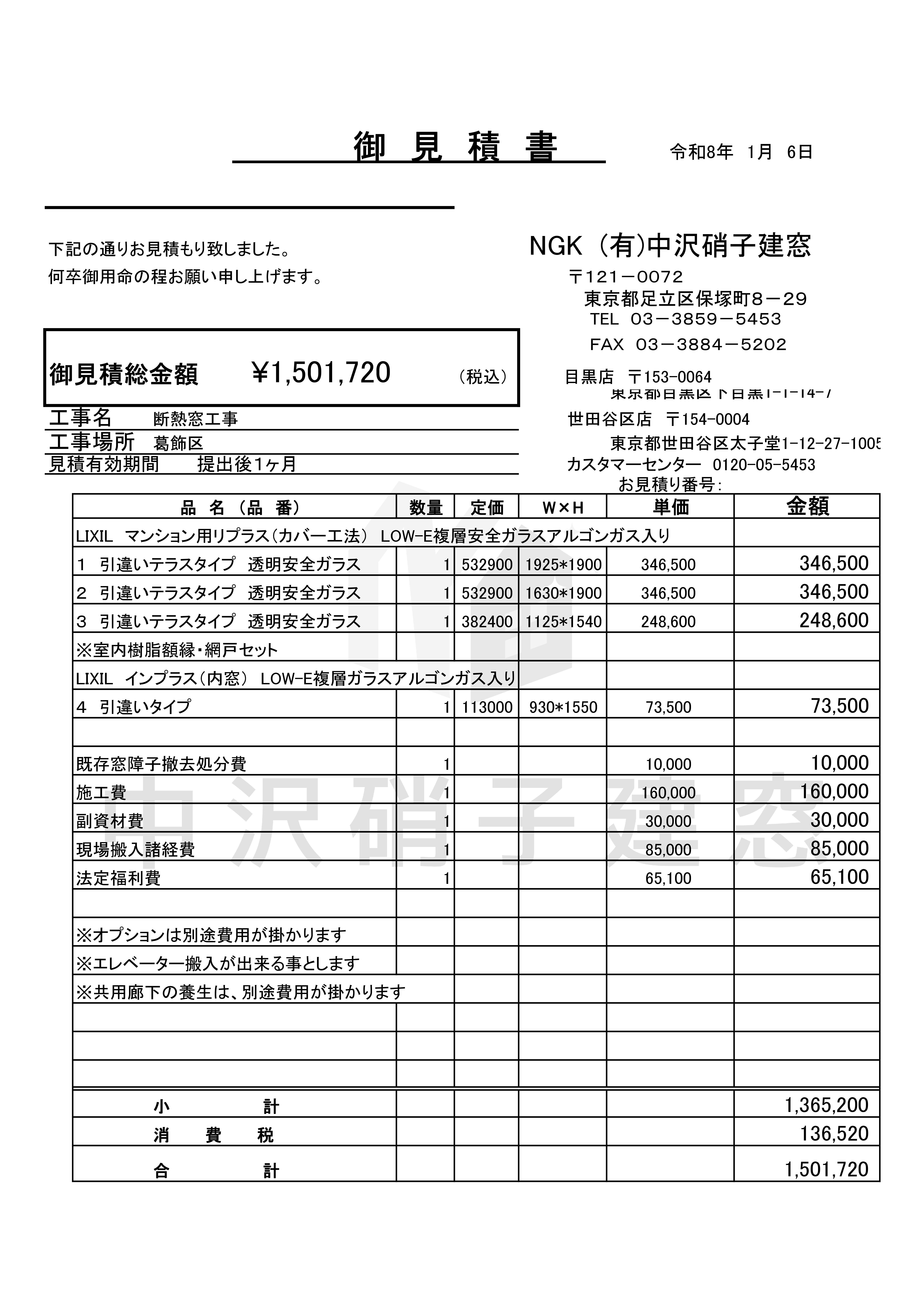 2026年1月6日 お見積り 1,365,200円(税別) 値上げ前。