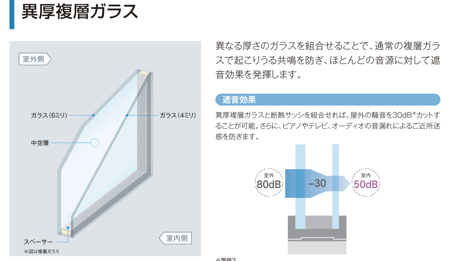 次に、建売住宅であれば3mm+空気層+3mmの複層ガラスが今は使われている事が多いので、その内側に3mm+空気層+3mmのLOW-E断熱ガラスアルゴンガスを入れたとすれば、これは全て3mmガラスで4枚のガラスが並ぶ事になりますので、共鳴をする事はほぼ無いと考えます。