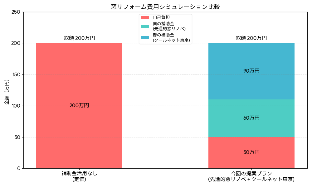 補助金の二重取り(トリプル受給)の効果最大化 国の「先進的窓リノベ」で高額補助を確保しつつ、都の「2.5倍加算」に「自治体の補助金」で自己負担が工事費の1/3で済む事もあります