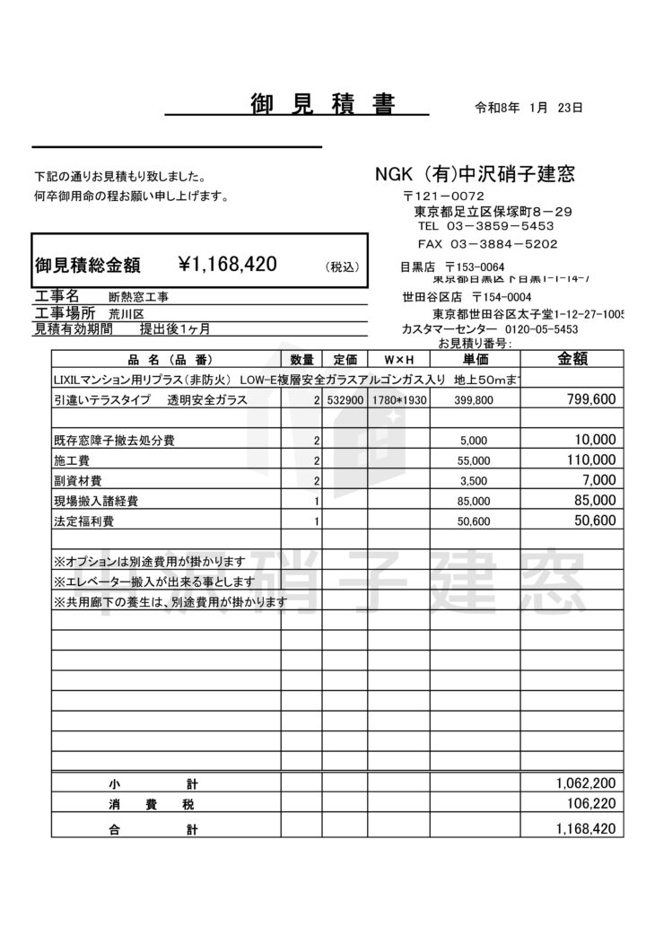 ここからは、実際の東京都荒川区でのマンション断熱窓2台リフォームを行ったら、いくらくらいかかるのかを説明していきます。