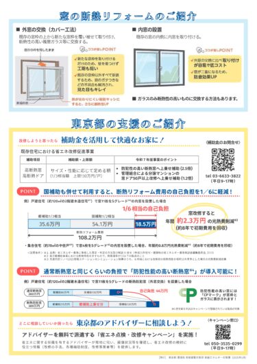 国に東京都や自治体では、省エネ性能の高い断熱窓リフォームに対して、手厚い補助金制度があります。