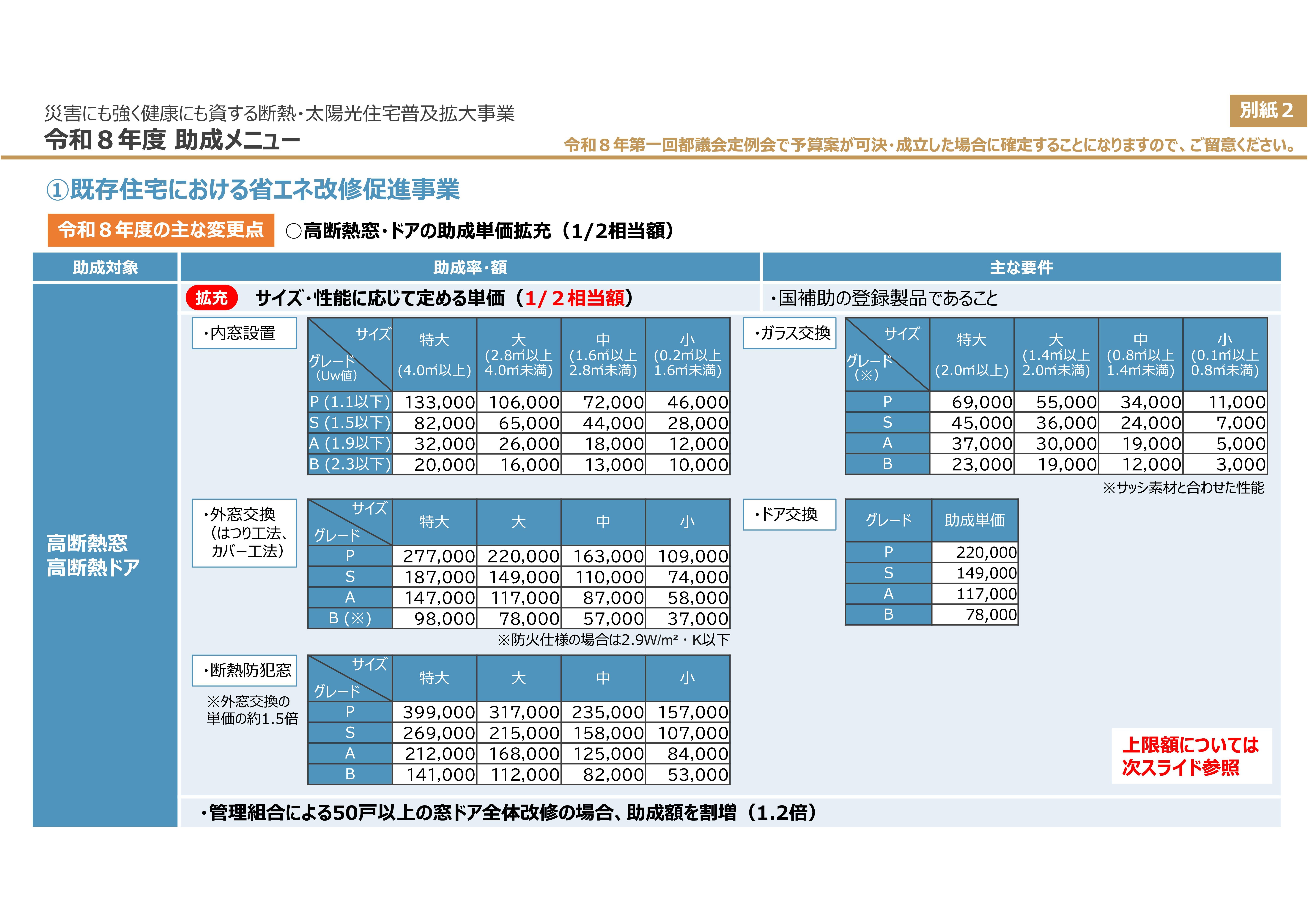 内窓設置、ガラス交換、外窓交換など、工事手法や窓のサイズ・性能のグレードに応じて、手厚い単価が設定されています