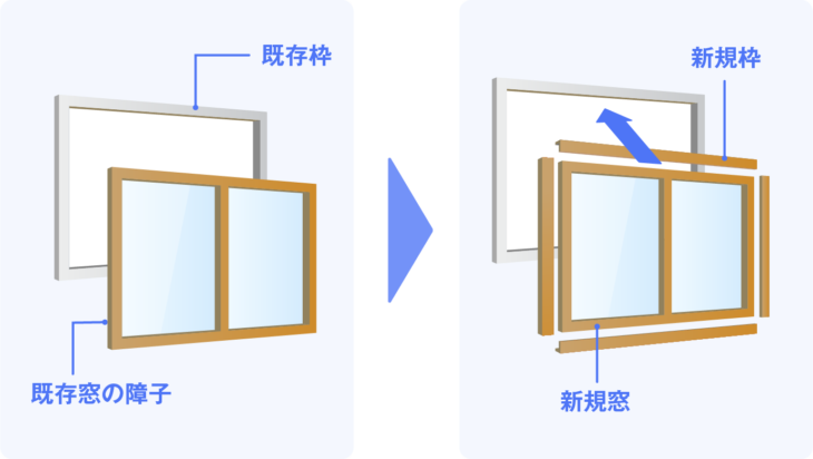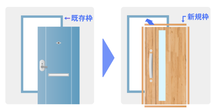 なお、「カバー工法」とは、既存ドアについて枠を残して取り除き、既存枠の上から新たな枠を取り付け、ドアを交換する工事をいいます。