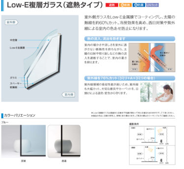 ガラスには、一般複層ガラス・LOW-E断熱ガラス・LOW-E遮熱ガラスを弊社では基本セットとしています。