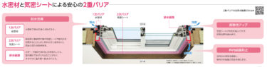 1次バリアで水密材で雨水の浸入を防ぎます。2次バリアで既設枠と新設枠の間の気密シートで室内外を密閉することにより、内外の圧力差をなくし雨水の浸入を防ぎます。