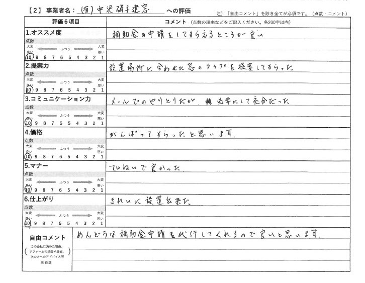 事業者の方はこちらからご覧ください トップへ戻る HOMEお客様の声お客様の声 お客様の声 1.オススメ度 5(良い)点補助金の申請をしてもらえるところが良い。 2.提案力 5(良い)点設置場所に合わせた窓のタイプを提案してもらった。 3.コミニュケーション力 5(良い)点メールでのやりとりだが、必要にして充分だった。 4.価格 5(良い)点がんばってもらったと思います。 5.マナー 5(良い)点ていねいで良かった。 6.仕上がり 5(良い)点きれいに設置出来た。 7.自由コメント めんどうな補助金申請を代行してくれるので良いと思います。 お客様の声一覧はこちら 中沢硝子建窓について 選ばれる理由 マドリモは私が考えました 会社案内 交換費用 交換費用一覧 窓 内窓 ドア エクステリア シャッターなど バルコニー、サンルーム 浴室ドア 施工事例 施工事例一覧 集合住宅の窓 戸建て 窓 ガラス交換 浴室折れ戸 窓 内窓 ドア エクステリア シャッター バルコニー、サンルーム その他 お客様の声 お客様の声一覧 窓リフォームコラム 窓リフォームコラム一覧 NEW補助金 目黒区 世田谷区 葛飾区 足立区 補助金 今井さんの窓日記 内科医が解説!窓コラム 窓リフォームコラム 今日の下見・契約・作業内容 ご挨拶 現場日記 その他 ドアリフォーム お役立ち情報 窓ペディア(窓リフォームの百科事典) 窓のリフォーム補助金一覧~最新情報~ 窓リフォームの補助金・助成金 動画の紹介 事業者様へ 賃貸オーナー、アパート大家様へ マンションの管理組合の方へ マンション・アパート玄関ドアリフォーム よくある質問 リフォームの流れ 写真を送るだけでオンライン見積もり オンライン相談 お問い合わせ お問い合わせ 無料お見積もり