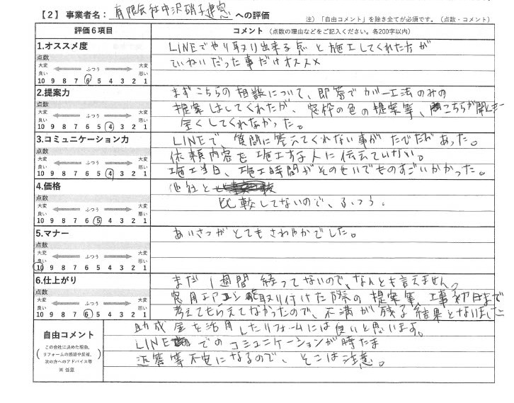 LINEで質問に答えてくれない事がたびたびあった。依頼内容を施工する人に伝えていない。施工当日、施工時間がそのせいでものすごいかかった。