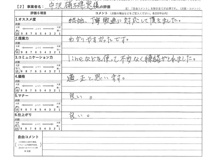 事業者の方はこちらからご覧ください トップへ戻る HOMEお客様の声お客様の声 お客様の声 1.オススメ度 5(良い)点終始、丁寧・敏速に対応して頂きました。 2.提案力 5(良い)点わかりやすかったです。 3.コミニュケーション力 5(良い)点lineなどを使って不安なく連絡がとれました。 4.価格 5(良い)点適正と思います。 5.マナー 5(良い)点良い。 6.仕上がり 5(良い)点良い。 7.自由コメント お客様の声一覧はこちら 中沢硝子建窓について 選ばれる理由 マドリモは私が考えました 会社案内 交換費用 交換費用一覧 窓 内窓 ドア エクステリア シャッターなど バルコニー、サンルーム 浴室ドア 施工事例 施工事例一覧 集合住宅の窓 戸建て 窓 ガラス交換 浴室折れ戸 窓 内窓 ドア エクステリア シャッター バルコニー、サンルーム その他 お客様の声 お客様の声一覧 窓リフォームコラム 窓リフォームコラム一覧 NEW補助金 目黒区 世田谷区 葛飾区 足立区 補助金 今井さんの窓日記 内科医が解説!窓コラム 窓リフォームコラム 今日の下見・契約・作業内容 ご挨拶 現場日記 その他 ドアリフォーム お役立ち情報 窓ペディア(窓リフォームの百科事典) 【最新情報】窓のリフォーム補助金一覧 窓リフォームの補助金・助成金 動画の紹介 事業者様へ 賃貸オーナー、アパート大家様へ マンションの管理組合の方へ マンション・アパート玄関ドアリフォーム よくある質問 リフォームの流れ 写真を送るだけでオンライン見積もり オンライン相談 お問い合わせ お問い合わせ 無料お見積もり