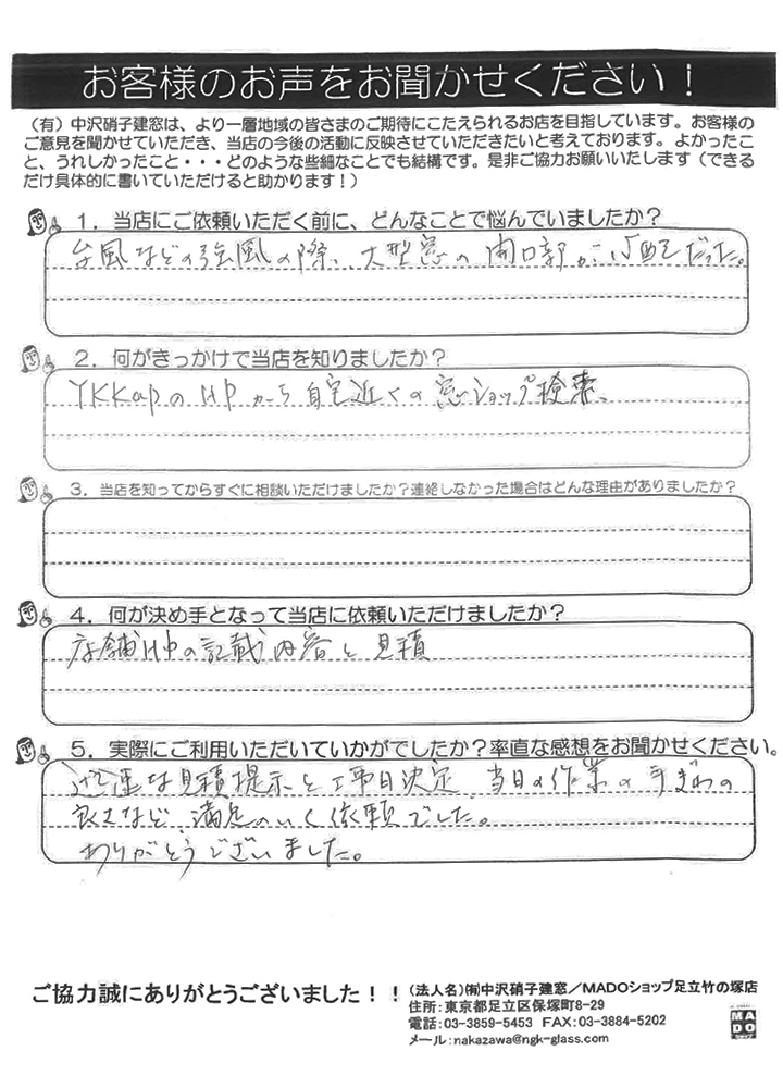 迅速な見積もり提示と工事日決定、当日の作業の手際の良さなど、満足のいく依頼でした。